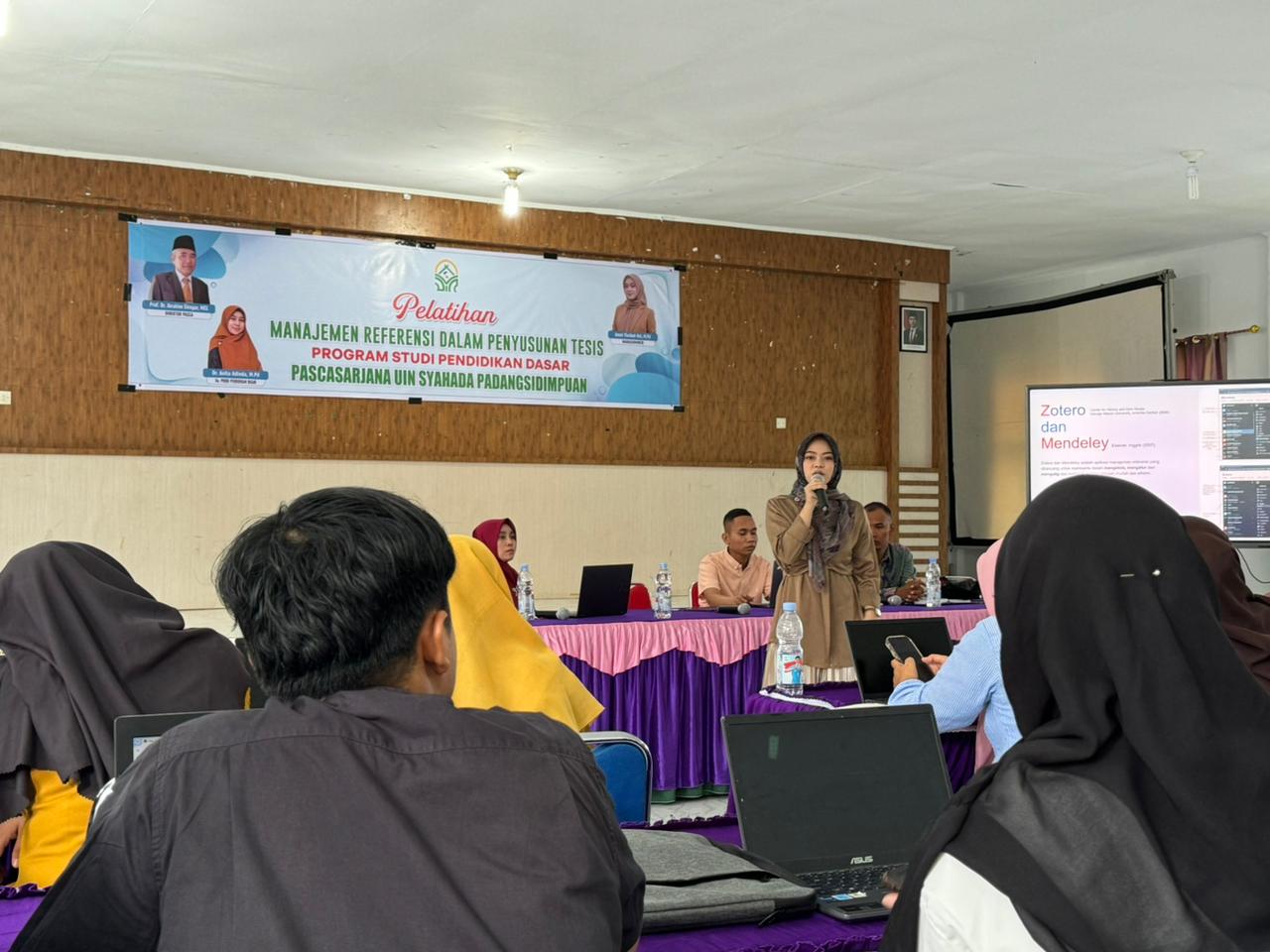 Pelatihan berlangsung di Aula Lantai II Gedung Rektorat UIN Syahada dan dibagi menjadi dua sesi. Sesi pertama diikuti sekitar 45 mahasiswa pascasarjana Program Studi Pendidikan Dasar, sementara sesi kedua diikuti sekitar 20 mahasiswa pascasarjana Program Studi Tadris Matematika UIN Syahada. Kegiatan dibuka oleh Dr. Anita Adinda, M.Pd. dan Dr. Suparni, S.Si., M.Pd., yang keduanya menekankan pentingnya pemanfaatan Zotero dan Mendeley agar mahasiswa mampu menyusun tesis dan artikel ilmiah secara profesional dan efisien.